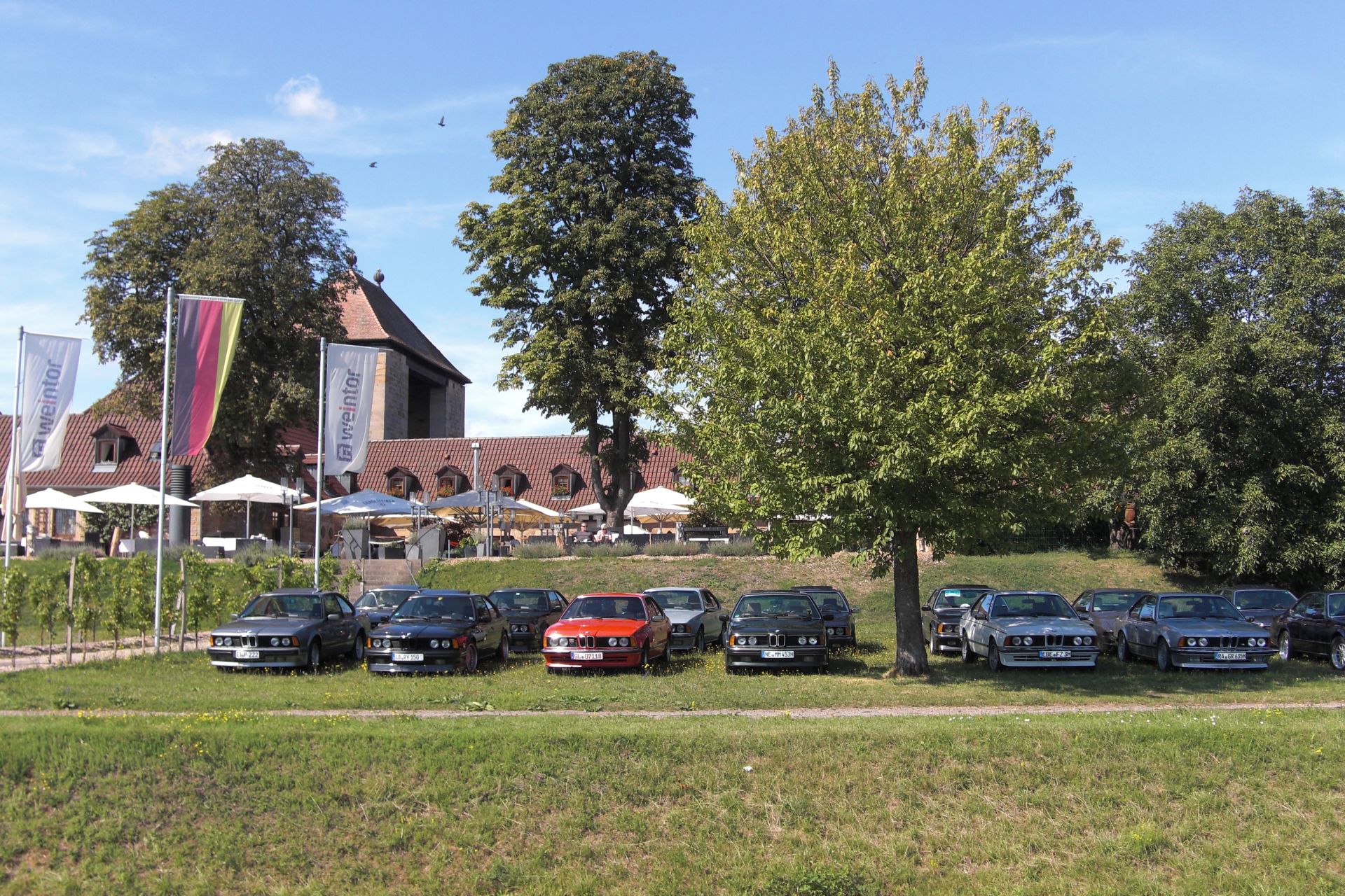 Im Verlauf der weiteren Strecke bis zum deutschen Weintor, war nahezu kein Fremdfabrikat in der Reihe unserer Fahrzeuge. Es war einfach wenig Verkehr. Wer im hinteren Drittel fuhr, hatte je nach Strassenverlauf einen grandiosen Blick auf eine endlose Schlage von hintereinander fahrenden E24 . Was wohl die Leute im Gegenverkehr dachten?
